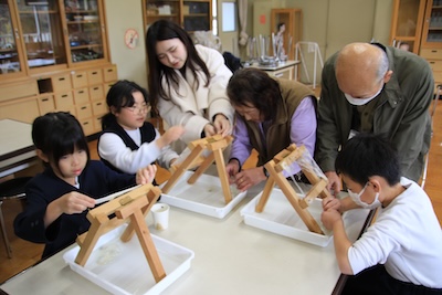 3年生 蚕から真綿づくり2023年11月16日 3年生では1学期から蚕の学習を続けてきました。 今日は大和高原文化の会のみなさん、畿央大学の先生、学生さんに来ていただき、蚕のまゆから真綿を作る体験学習をしました。 玉まゆ(2頭以上の蚕が一緒につくった大きなまゆで形もいびつ)を煮たあと、引き伸ばして木枠にかけて、四角く引き伸ばされた真綿を作っていきました。 古くから日本の養蚕農家で行われてきた、”伝統のわざ”を体験することができました。