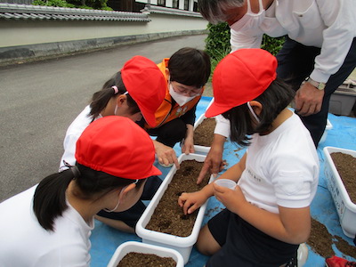 人権擁護委員さんと1年生がひまわりを植えました。2023年05月25日 人権の大切さを伝える活動を日々行なっている、人権擁護委員さん。 たくさんのプランターと種を用意してくださり、1年生といっしょにひまわりの種を植えました。 夏にはきれいなひまわりの花が咲くでしょう。今からたのしみですね。