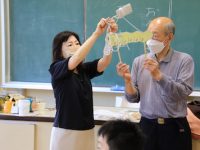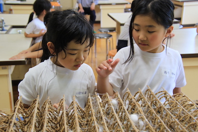 3年生 蚕の学習2023年06月29日 畿央大学の先生、大和高原文化の会のみなさんが来てくださり、3年生に「おかいこさん」についてお話をしてくださいました。 かつて大和高原で盛んであった養蚕(ようさん)を知りました。お蚕(かいこ)さんと呼ばれて大事にされていたことや、蚕が繭をつくり、生糸ができるまでをクイズや資料を交えて学びました。 子どもたちは熱心にお話を聞き、初めて知ったことに目を丸くさせていました。