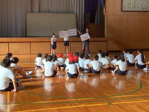 頑張って応援しようね!2025年09月30日 運動会に向けて、紅組白組に分かれて応援練習に取り組んでいました。 応援係を中心に、数パターンのかけ声の仕方を練習していました。 運動会本番、各組の団結した応援が見られるのが楽しみです!