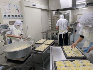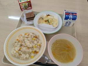 昨日の給食は一足早いクリスマスメニューで、牛乳・ピラフ・マカロニグラタン・オニオンスープ・クリスマスケーキに子ども達は大喜び。『おいしい!』の声がたくさん聞こえてきました。