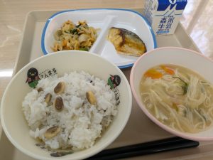 そんな今日の給食は、山添村の特産物である『まめくら大豆』を使ったごはんと、奈良県の郷土料理であるにゅうめんです。まめくら大豆は花香房さんから、にゅうめんの素麺はたつみさんから仕入れています。